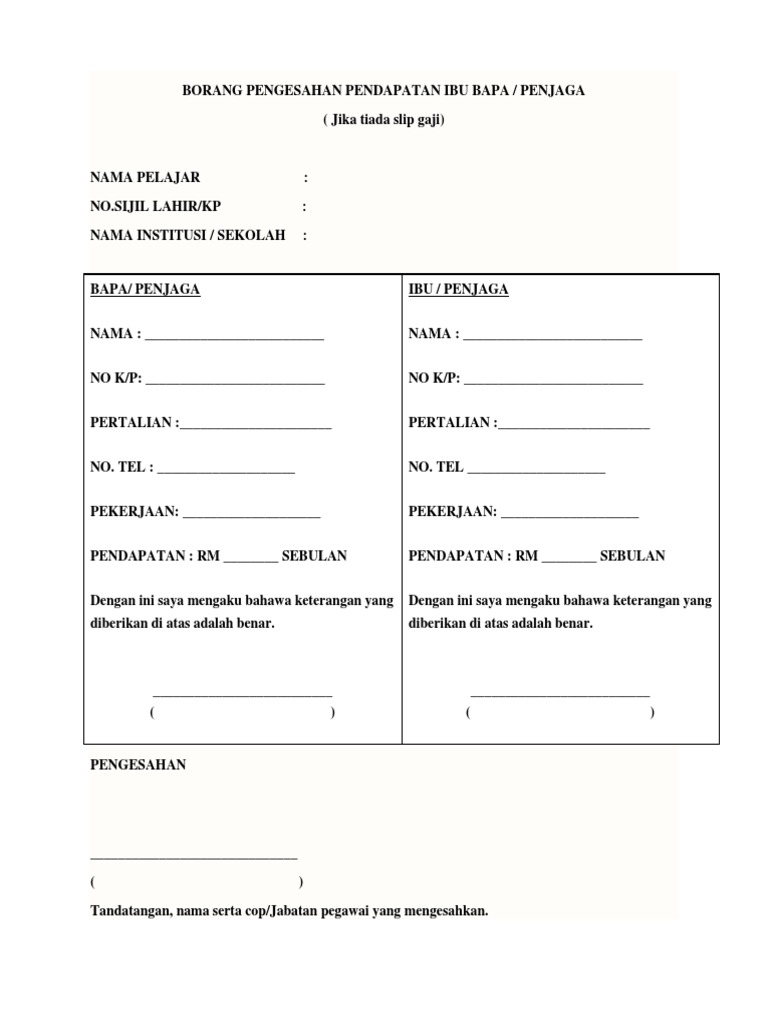Mohon pihak ibu bapa atau penjaga dapat menonton video ini sehingga tamat. Borang pengesahan pendap… 595 x 842 · png. Borang pengesahan pendapatan keluarga (hanya diisi oleh bapa/ibu/penjaga yang tidak mempunyai slip gaji/ penyata email protected yang tidak bekerja). Borang pengesahan pendapatan1 by awani 11708 views. Contoh surat akuan zona ilmu 6.