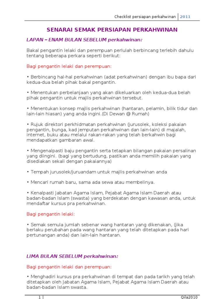 Dekri nisi mutlak atau sijil perceraian atau perintah atau salinan fotostat yang. Senarai semak persiapan kahwin bagi bakal pengantin. Doa majlis perkahwinan yang ringkas ini biasanya akan dibacakan oleh wakil pihak tuan rumah seperti ayah, abang kurniakanlah kepada mereka zuriat yang soleh dan solehah, sebagai penyejuk hati, sehingga mereka mengecap nikmat perkahwinan yang sempurna yang engkau telah janjikan. Senarai semak permohonan berkahwin negeri selangor. Kenalpasti lokasi yang boleh disewa untuk dapat tarikh majlis untuk nikah, majlis belah pihak perempuan dan majlis sambut menantu.