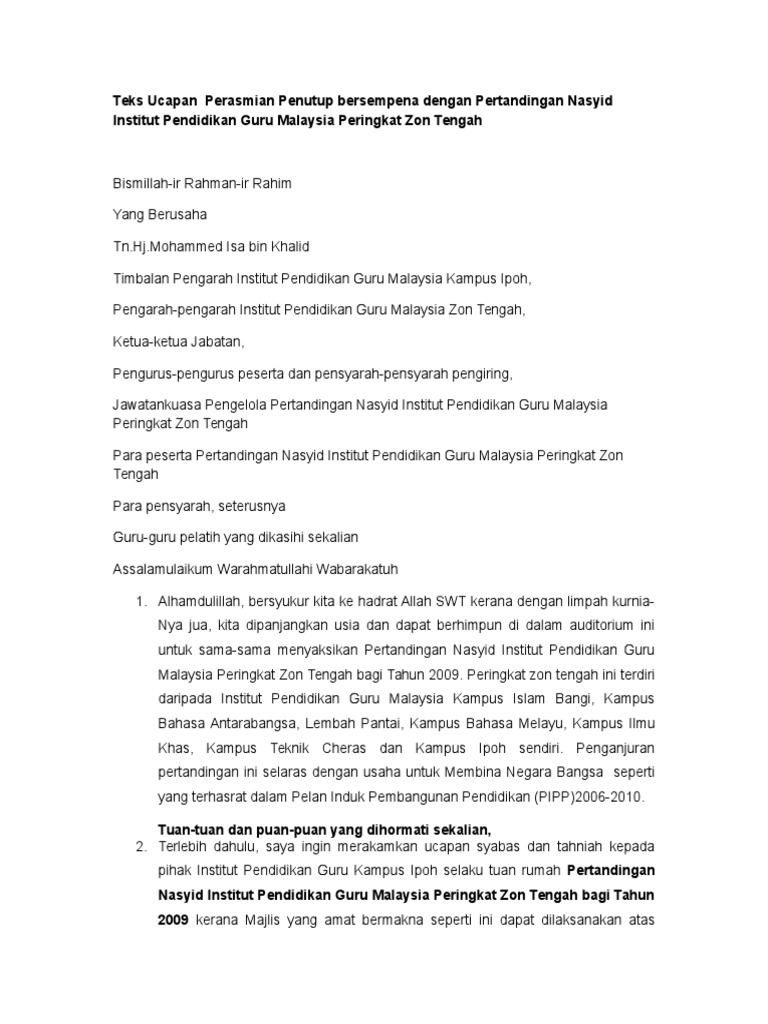 Skrip Majlis Perasmian Penutup Sukan from imgv2-2-f.scribdassets.com Nasional mac 17, 2021 @ 2:52pm. Ahmad and dato}, year={2016} }. Pengoperasian institusi pendidikan di bawah kpm serta peperiksaan awam tahun 2020. Semua pemain mesti bersatu padu untuk menjadi juara tanpa mengira warna kulit, bangsa, dan agama.sebagai mengakhiri ucapan ini, saya. @inproceedings{ahmad2016teksun, title={teks ucapan nc penutup sukum 2016}, author={m. Menteri perdagangan antarabangsa dan industri. Teks penuh ucapan perdana menteri. Oleh armansyah berikut adalah teks pembuka dan penutup khutbah jum'at yang biasa dibacakan oleh khatib.