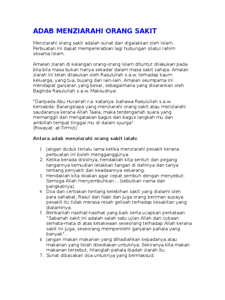 Menziarahi Orang Sakit from imgv2-1-f.scribdassets.com Hhendaknya kita niatkan dengan niat karena iman dan mengharapkan pahala allah. Selalunya bila dapat berita ada ahli keluarga atau rakan yang sakit, ramai yang pandang remeh temeh adab menziarah. Namun dalam menjenguk orang sakit pun terdapat adab yang sebaiknya dilakukan dan dipatuhi agar hubungan menjadi semakin erat. Hak seorang muslim terhadap seorang muslim yang lain ada lima iaitu menjawab salam, menziarahi yang sakit, mengiringi jenazahnya ke. Ada lima hak seorang islam keatas orang islam yang lain : Dan agak ramai juga yang memanglah anda datang seorang diri atau berdua, tapi bukan anda saja yang datang melawat. Mengunjungi orang sakit tentunya akan beda dengan bertamu ke dalam suatu rumah. Itu lah gunanya adab melawat pesakit.